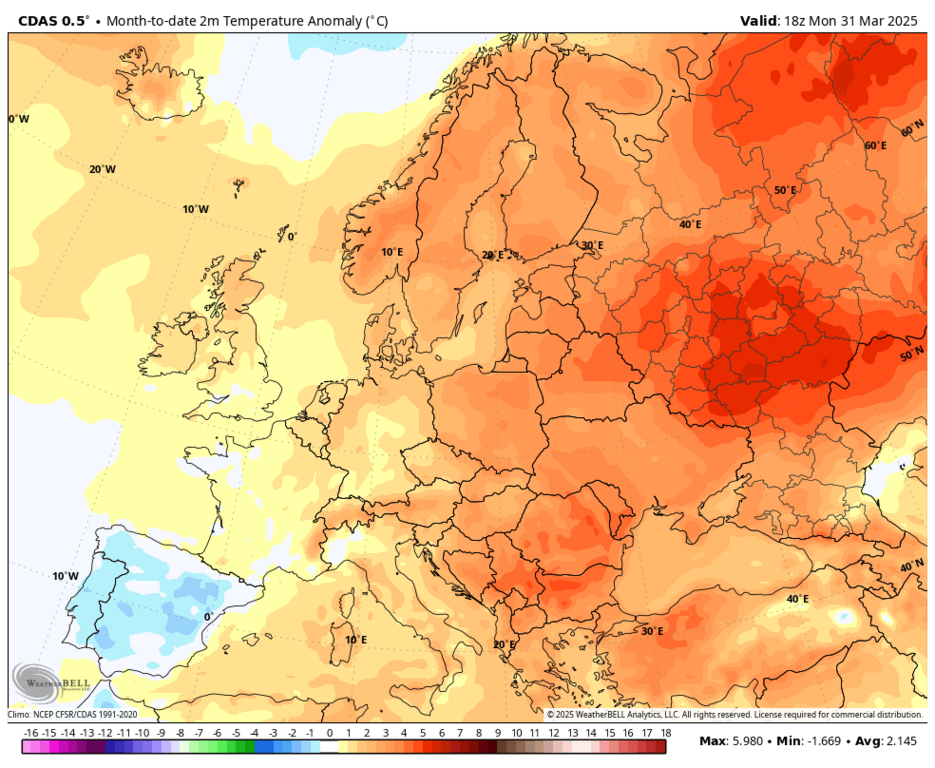 Если взглянуть на температурные аномалии нынешнего марта по всей Европе, то хорошо заметно, что практически во всех регионах первый месяц весны был аномально тёплым, особенно в восточной части Европы. В качестве исключения можно выделить только Пиренейский полуостров (Испания, Португалия), где март оказался прохладным.
